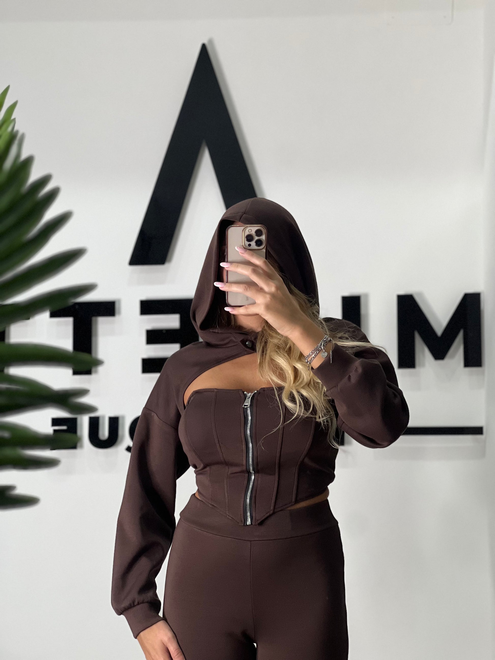 Completo tre pezzi marrone che unisce stile e sensualità.